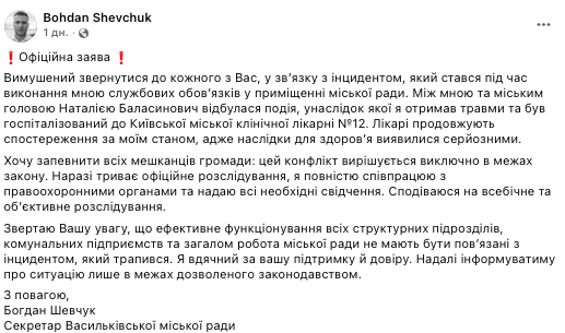 «Вимушений звернутися до кожного з Вас у зв’язку з інцидентом, який стався під час виконання мною службових обов’язків у приміщенні міської ради. Між мною та міським головою Наталією Баласинович відбулася подія, унаслідок якої я отримав травми та був госпіталізований до Київської міської клінічної лікарні №12», — написав Шевчук. Він додав, що наслідки для здоров’я серйозні, лікарі продовжують спостереження.