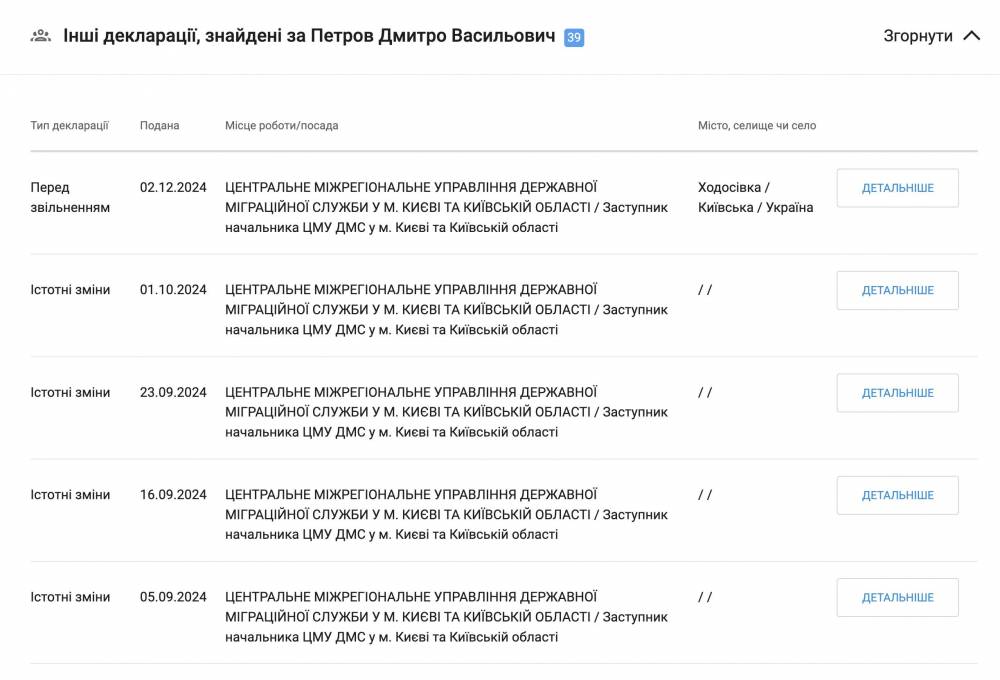 Раніше зазначалося, що Петров протягом трьох років займався нелегальними схемами у міграційній службі Києва та області. Тепер же його декларації повністю зникли з реєстру — мова йде про три десятки звітних документів.